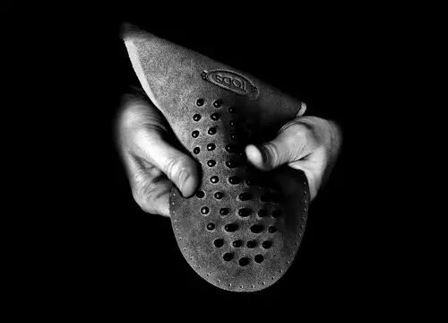 每双鞋的“豆豆”们完全是依据人体力学设计并纯手工制作的,易摩擦的着地部位用大颗“豆豆”,不易吃力的部位则用小粒“豆豆”,使脚底着地时感觉的舒适度和力度都达到最佳值。Tod's 有专门的模具可以让工匠们敲出鞋底的“豆豆”,之后再手工缝制鞋面与鞋底的接口,为了保持针孔间的距离均匀,还会事先做好印记。而“豆豆鞋”使用的缝制线上的蜡和胶水,在烤箱中会融化,把整双鞋上所有的空隙都填满。