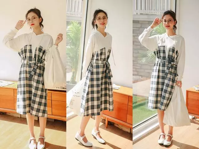 这款格子拼接的卫衣裙,它的设计一眼就可以赚足眼球了,清新的格子元素,复古又时髦,宽松的版型让各种身材的妹子都可以轻松驾驭,休闲自在,腰身配有腰带的设计,很人性化的设计,让瘦小个子的妹子,都可以穿出曼妙的身姿,刚好过膝盖的长度,小个子的女生穿上也很显高挑,搭配一双一字扣平底单鞋,舒适又很时髦,还很减龄显气质的。
