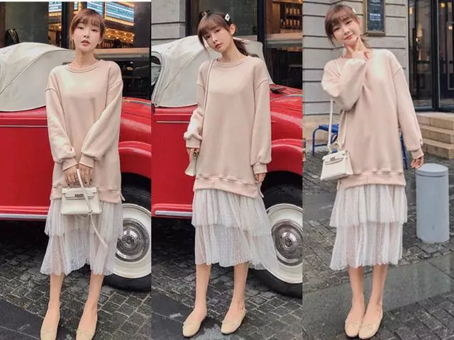浅粉色的单品总会受到妹子们的宠爱,上身能够满足你的少女心,而这款粉色卫衣裙,上半身是很简单的粉色卫衣,足够让你美而时髦的了,加上宽松的版型,不挑身材,不挑人,随便穿上身就可以凹出美美的造型look,下摆的双层薄纱才是这款卫衣裙最美的地方,薄透的设计,诱惑感十足,还散发出小性感气息,双层的设计,更是女人味十足,融入了波点的元素,还多了点小俏皮的浪漫气息,搭配一双蝴蝶结平底单鞋,非常舒服,非常美。