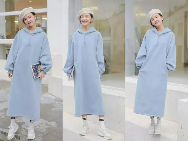 一款好看的蓝色卫衣裙,这种淡淡的蓝色,今年尤其的流行,上身不仅凸显气质,还很能提亮你的肤色,显白妥妥的,宽松的直筒版型,对于微胖的女生来说灰常友好,上身就很显瘦,更好地修饰你的身材曲线,过膝的长款版型,露出你小脚踝的肌肤来,性感多了,搭配白色运动款的平底鞋,有点内增高的设计,再外搭一双中筒袜子,条纹的设计,让你造型更时髦好看,并且视觉上更显高挑,2019春季这样搭舒适好看又时髦!
