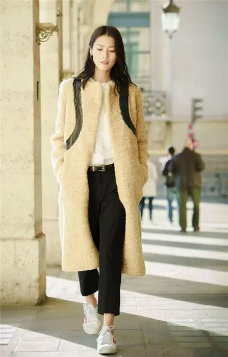 淡黄色的毛绒长大衣,显出清新淡雅的气质。内搭白色单品,衬得肌肤白皙又细腻,超级耐看。这时候,直筒型的小黑裤依旧用得着,隐藏不完美的腿型,显出满分的大长腿。脚踩白色的运动鞋,裤子九分的长度,将嫩白的脚踝衬得恰到好处。