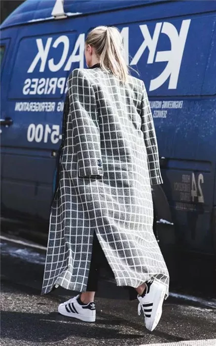 经久未衰的格纹元素,在冬天也火了一把,这件带有开叉设计的格纹大衣,能让你走路带风,随时随地都能扮酷。穿大衣的时候想显瘦,小黑裤依旧用得着,配上白色运动鞋,黑白配给你十足的经典时尚感。
