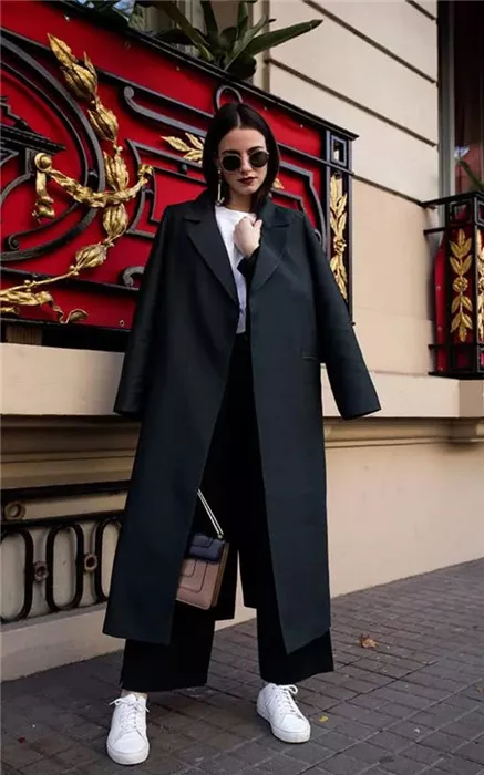 依旧是经典的黑白配,不过这身造型显得更有酷感。黑色阔腿裤+白色运动鞋,休闲舒适又时尚。白色运动鞋想出彩?Pick黑色的长大衣,让你继续保持酷girl的属性,展现霸道女总裁的气质。